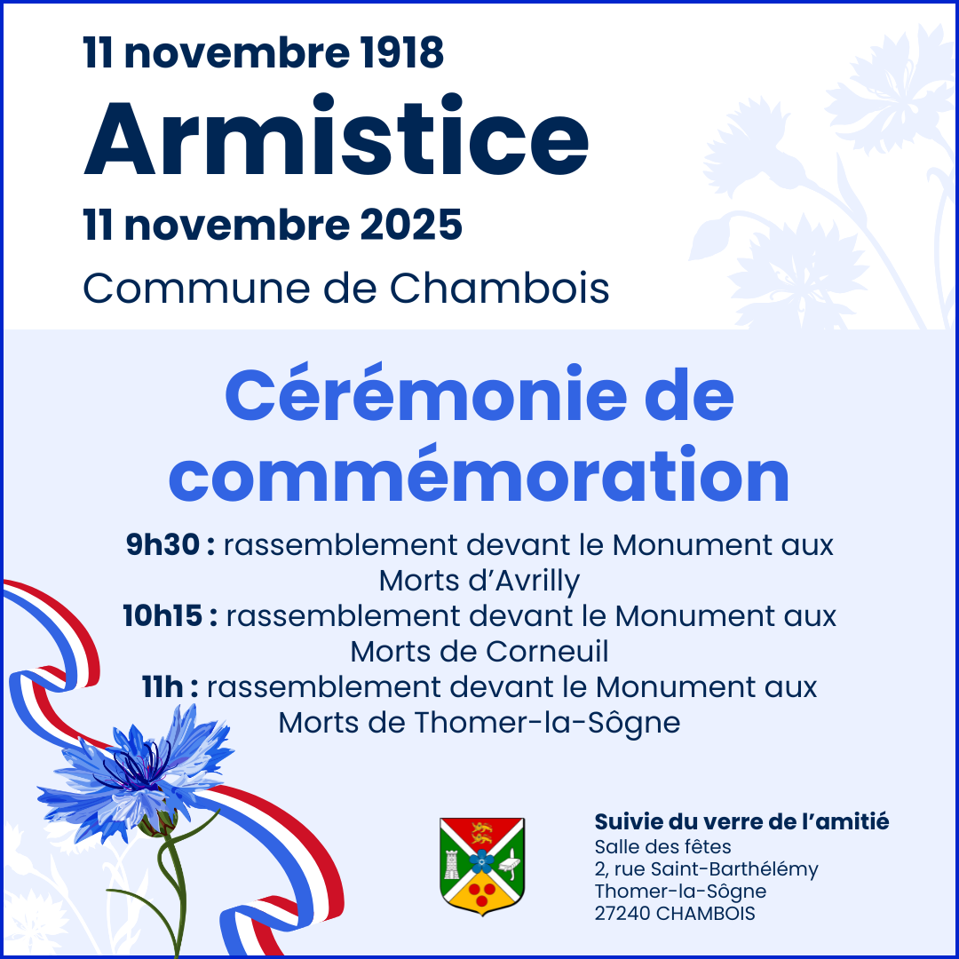 L’équipe municipale de Chambois vous convie à participer à la Commémoration de l’Armistice du 11 Novembre 1918 et à l’hommage qui sera rendu à tous les morts pour la France.